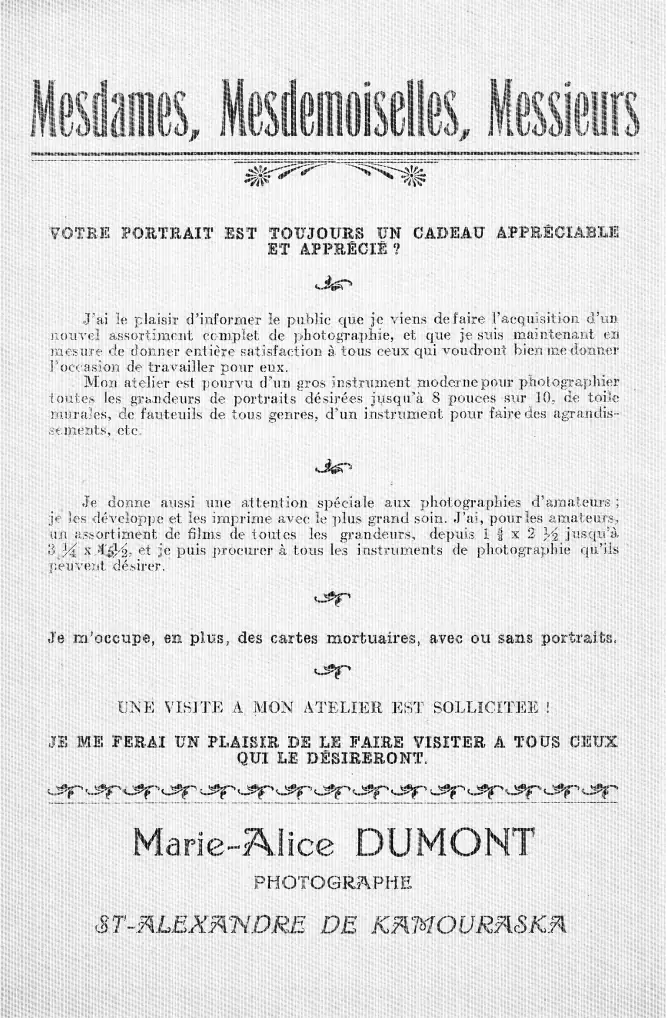 L’abbé Napoléon lui a donné quelques notions de photographie, parce que lui était professeur au Collège de la Pocatière puis il faisait de la photographie lui aussi. Ensuite là, monsieur Ulric Lavoie de Rivière-du-Loup, le photographe, lui, il lui a aidé aussi.