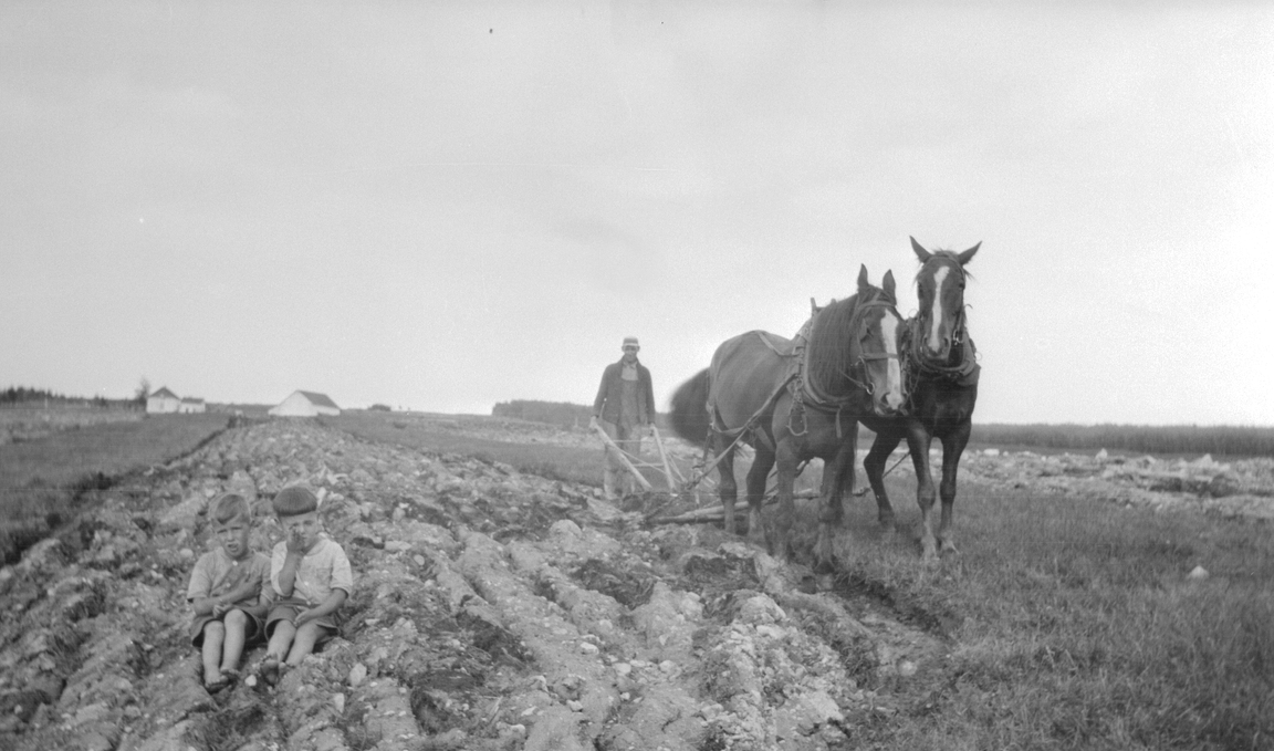 1923-1928Photographe: Photographe : Marie-Alice DumontFaire les foins est une tâche qu’ont connue beaucoup de familles du Kamouraska dans la première moitié du 20e siècle. La composition de cette photographie de Marie-Alice Dumont rend bien l’immensité de la corvée à accomplir. La diagonale de l’image, partant du bas à gauche pour monter vers la droite, jusqu’à l’horizon, donne une certaine profondeur à l’image. Quant à elle, la quantité impressionnante de tas de foin captés par l’appareil donne une idée du temps déjà passé au champ, fourche à la main. De plus, le foin encore debout au bas de l’image, à droite, laisse entrevoir la besogne qu’il reste à accomplir. Si Dumont voulait transmettre l’impression d’un long et dur labeur, l’effet est réussi.