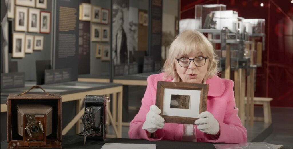 Plan sur l’experte interviewée, Madeleine Marcil, historienne de l’art et de la photographie et photographe. Elle est devant une table où se retrouvent plusieurs artefacts photographiques. Derrière elle se trouve l’exposition Visages et Paysages du musée du Bas-Saint-Laurent.